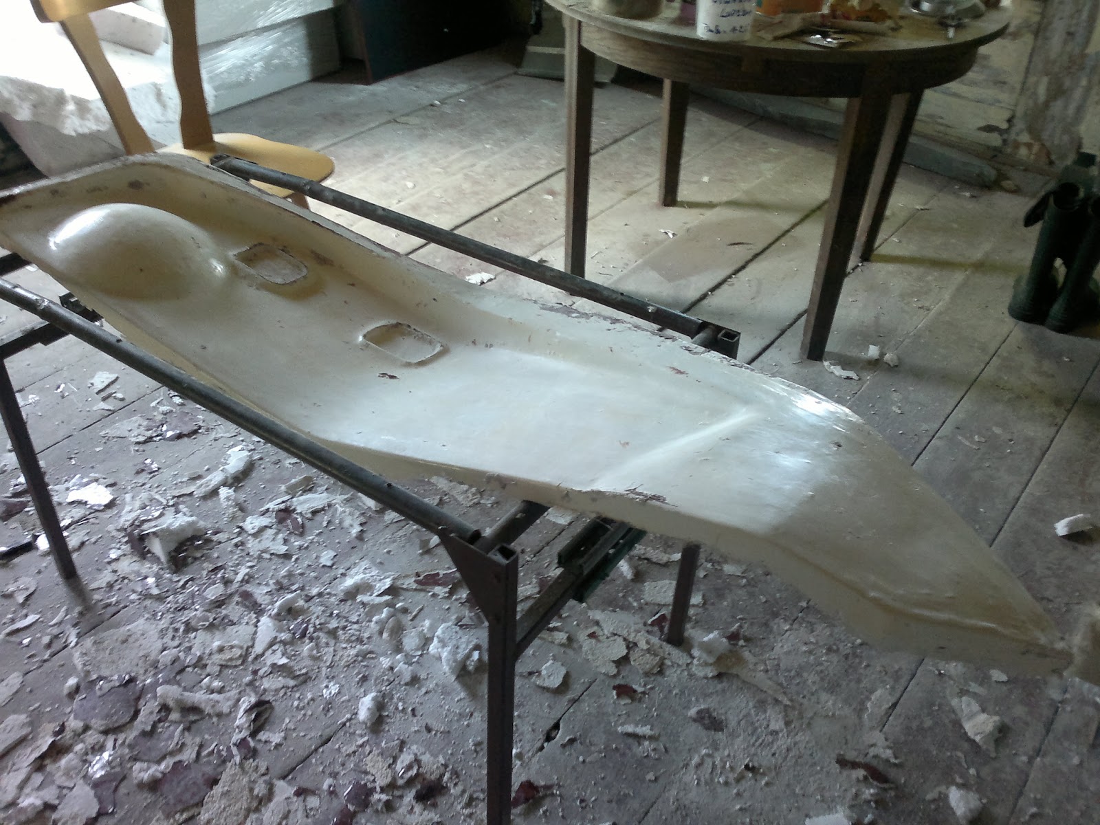W miniony weekend wyjąłem kolejne dwa elementy, które laminowałem tydzień wcześniej. Są to elementy boczne nadwozia. Postanowiłem sam się tym zająć, nauczyć się i przy okazji przetestować różne metody separowania od formy. Tutaj mam cały czas największy problem. Na zdjęciu powyższym jedna połowa formy pomalowana żelkotem. Pod spodem znajduje się farba olejna, jeszcze głębiej gips i szpachla samochodowa, która zresztą wyjadła mi odrobinę styropianu.